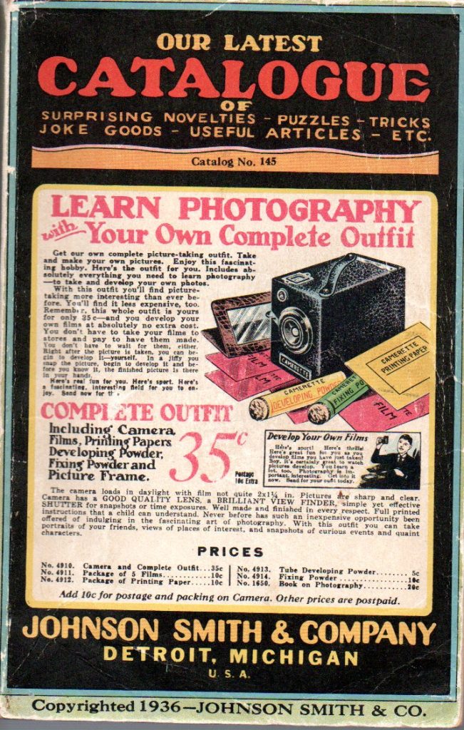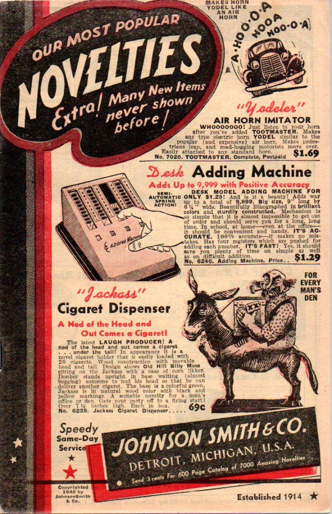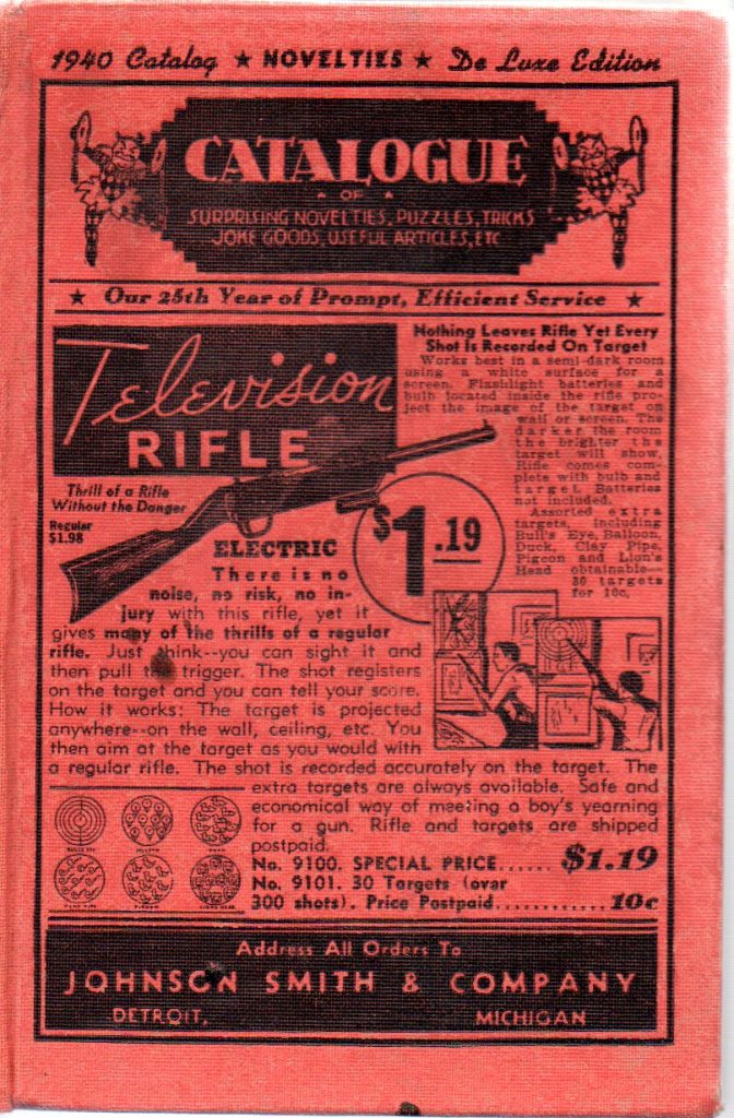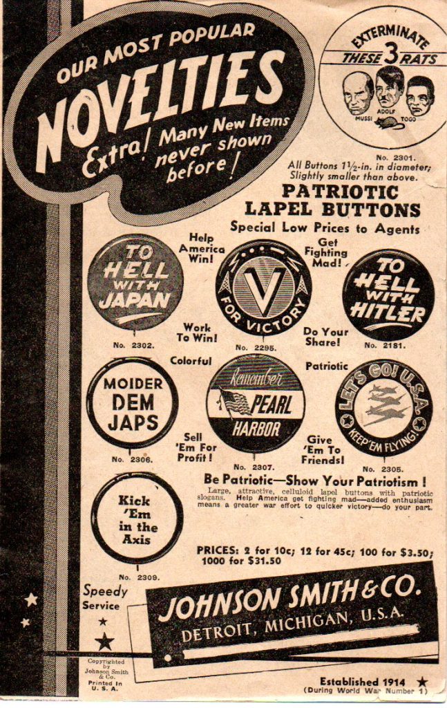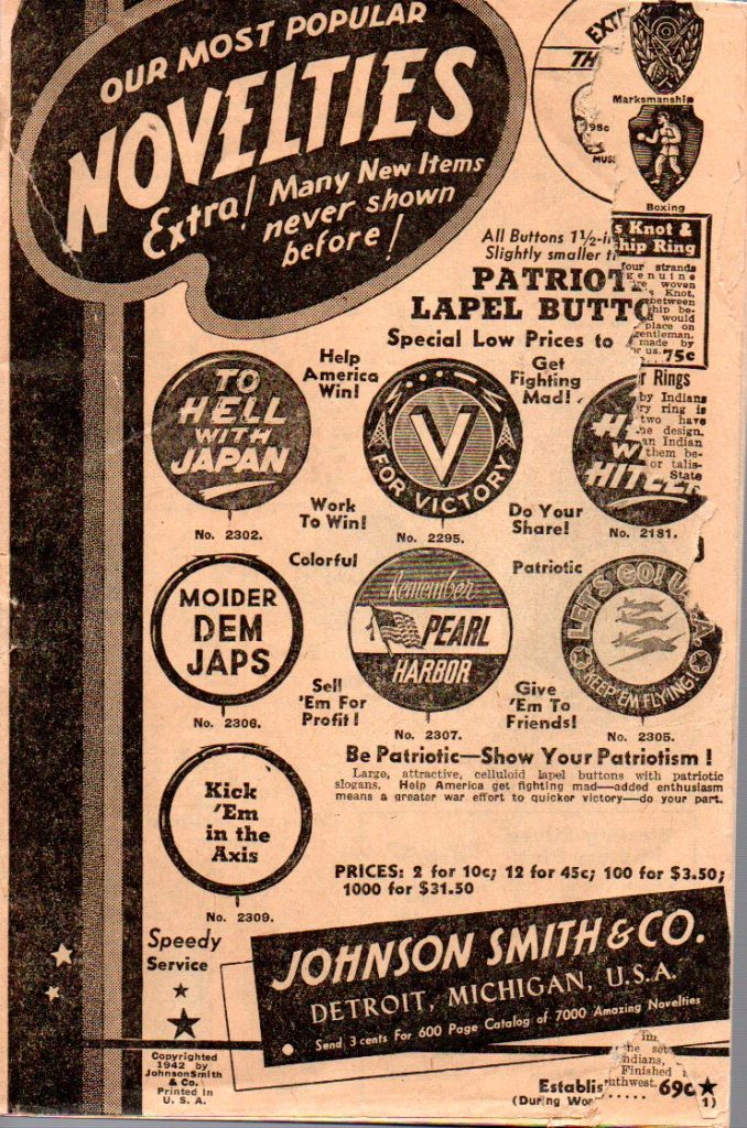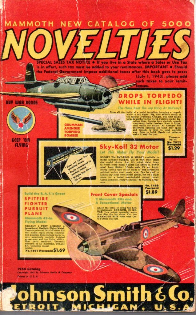 Notes: Anti-axis war related merchandise. This catalog was likely produced just after Pearl Harbor and distributed early in 1942. The Copyright is 1942 and a note in the lower right corner of the cover, as seen in a duplicate catalog, states “During World War, Number 1” (see 1942 Johnson Smith & Company Catalog (4).