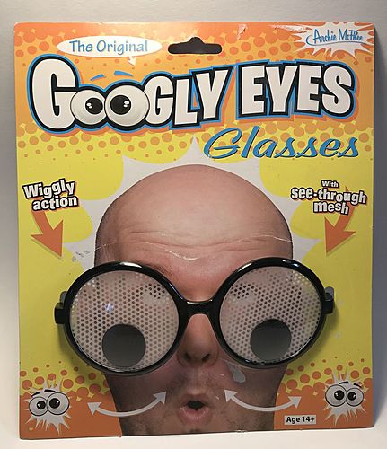 Description: “Googly Eyes Glasses” are a pair of large glasses with mesh lenses and black pupils that move around “googling”.