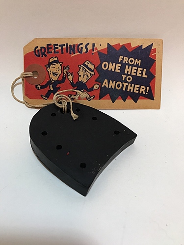 Description: Item #720 “Greetings From One Heel To Another” is a souvenir mailer with a rubber shoe heel and a mailing tag.
