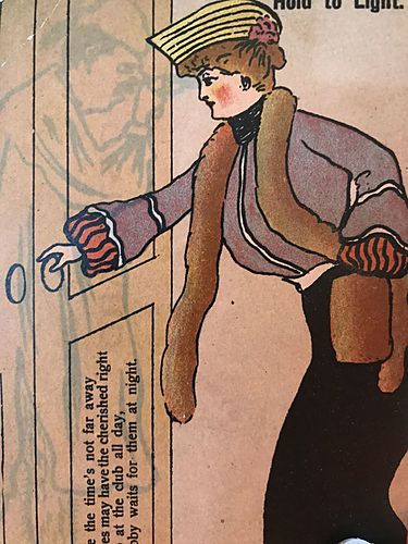 Description: “Hold To Light” is a postcard of a woman opening a door. The caption reads, “Lets hope the tim’s not far away, When wives may have the cherished right, To gossip at the club all day, While hubby waits for them at night.” When you hold the card to the light you see an image of a man holding a candle at the door.
