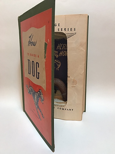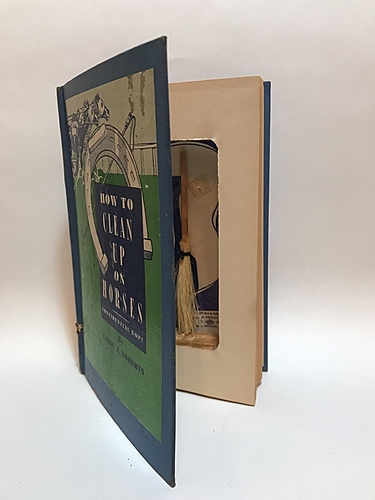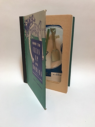 Description: Item #876 “How To Clean Up On Horses” gag book is an actual book with a replaced cover and pages cut out to show the gag of a shovel and broom inside.