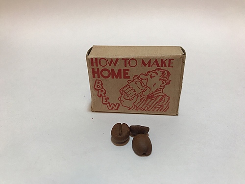 Description: This little gag box has coffee beans inside. It is unknown who made this or where it came from.