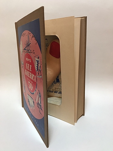 Description: Item #877 “How to See America For Less Than 50¢” gag book is an actual book with a replaced cover and cut out pages to display the joke, which is a large plastic thumb. The interesting thing with this book is that the information about the Fishlove company is handwritten on the front cover. The book is stamped Souvenir of Rochester, New York on the inside.