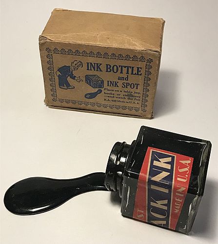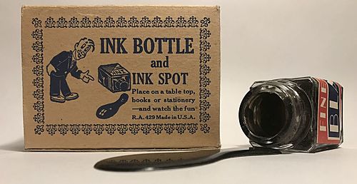 Description: Item #429 “Ink Bottle and Ink Spot” is a phony bottle of ink with a metal piece that looks like an ink spill.