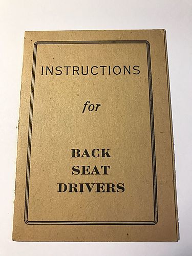 Description: “Instructions For Back Seat Drivers” is an advertising card that, when opened, says “Shut Up!” The back is advertising for the Machinery & Supply Company.