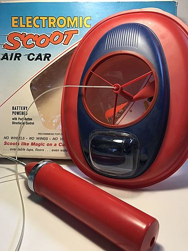 Description: “Electromic Scoot Air Car” is a battery operated hovering car with a push-button directional control.