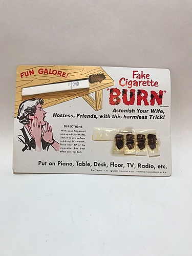 Description: Item #661 “Fake Cigarette Burn” is a sticker that looks like a burn, which can be placed anywhere next to a cigarette.