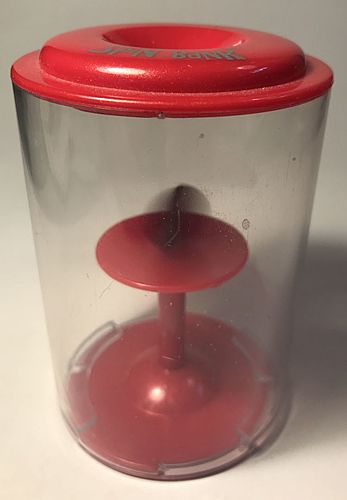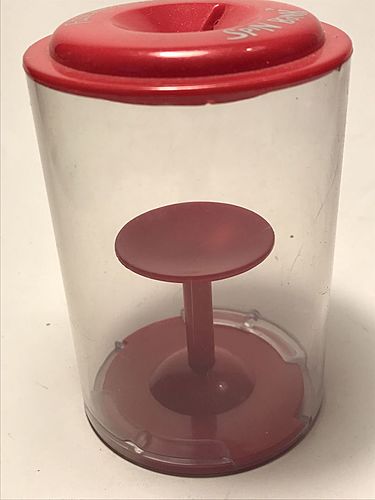 Description: “Fascinations Spin Bank” is a cylindrical bank with a pedestal inside. When you put a penny in the bank it spins on the pedestal.