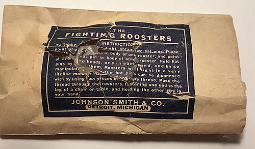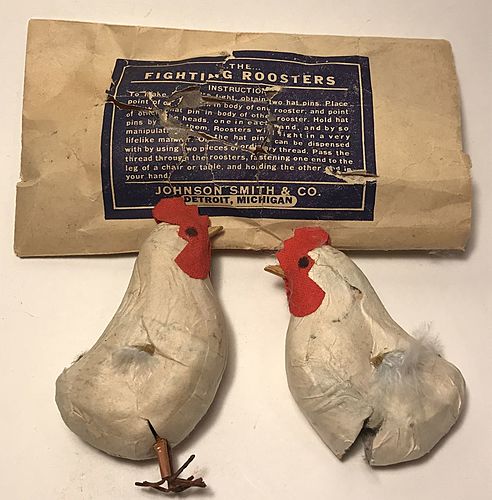 Description: “Fighting Roosters” is a game where you cause the roosters to “fight” by placing them on hat pins and connecting them by thread.
