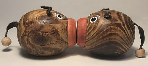 Description: “Kissing Pigs” is a pair of pigs connected by a thin cord. The cord is attached to one pig’s nose and to the other pig by a motorized pulley. When you pull the pigs apart and let go, they instantly move toward each other and you can hear a motor or winder of sorts.