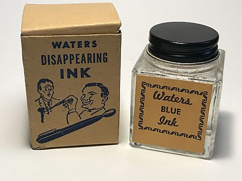 Description: “Waters Disappearing Ink” is a bottle of ink that can be sprayed on someone with an ink pen and it will disappear after a while.